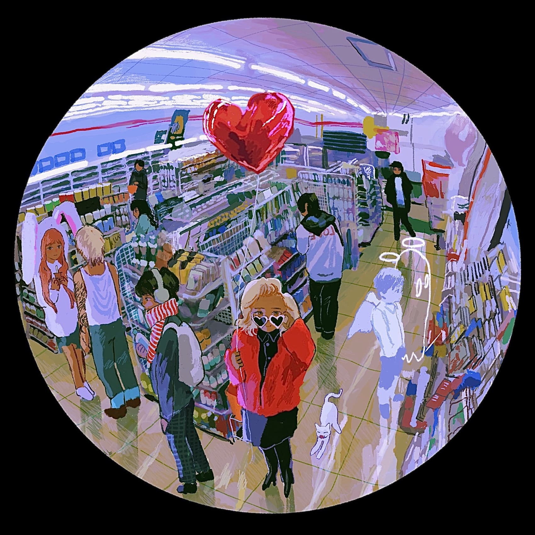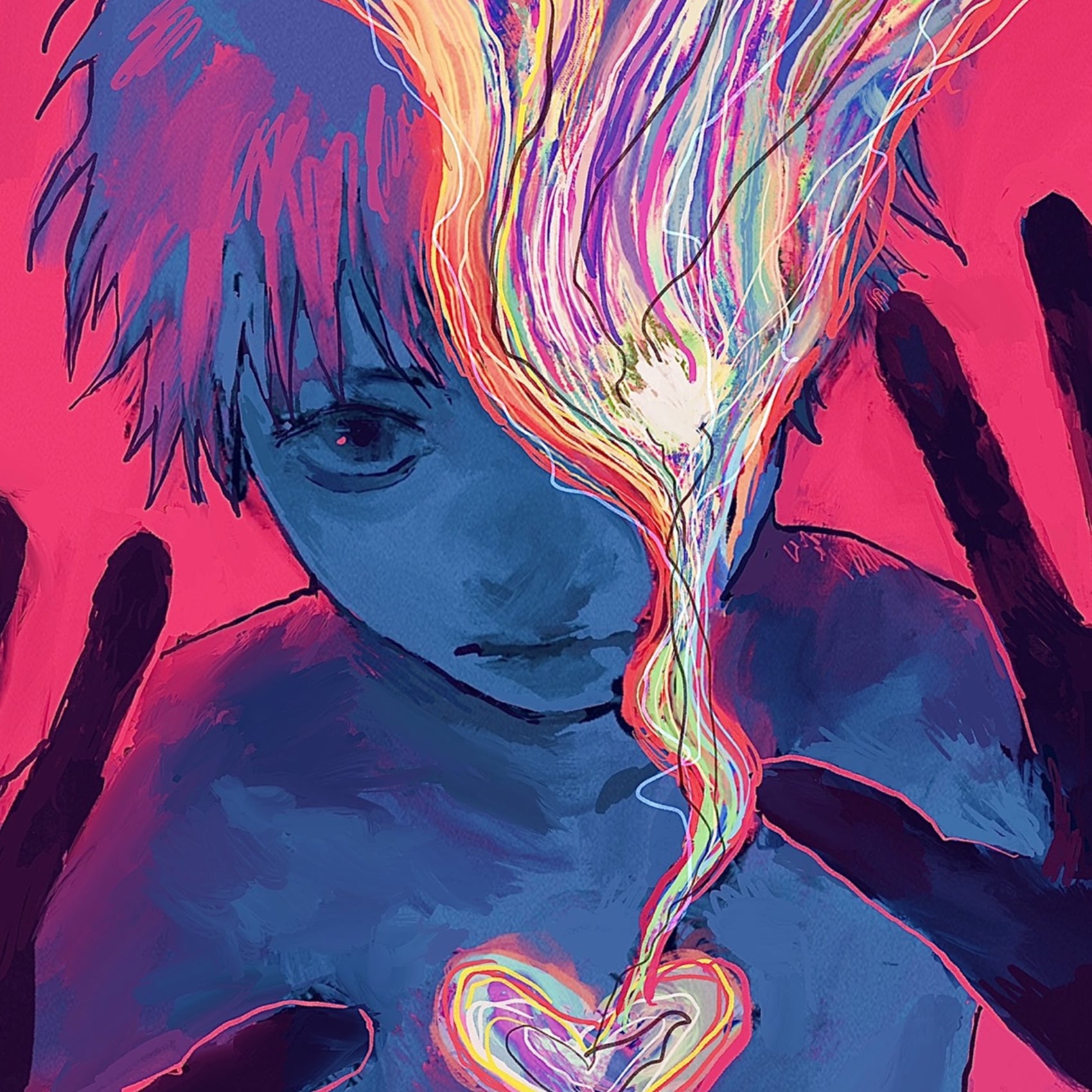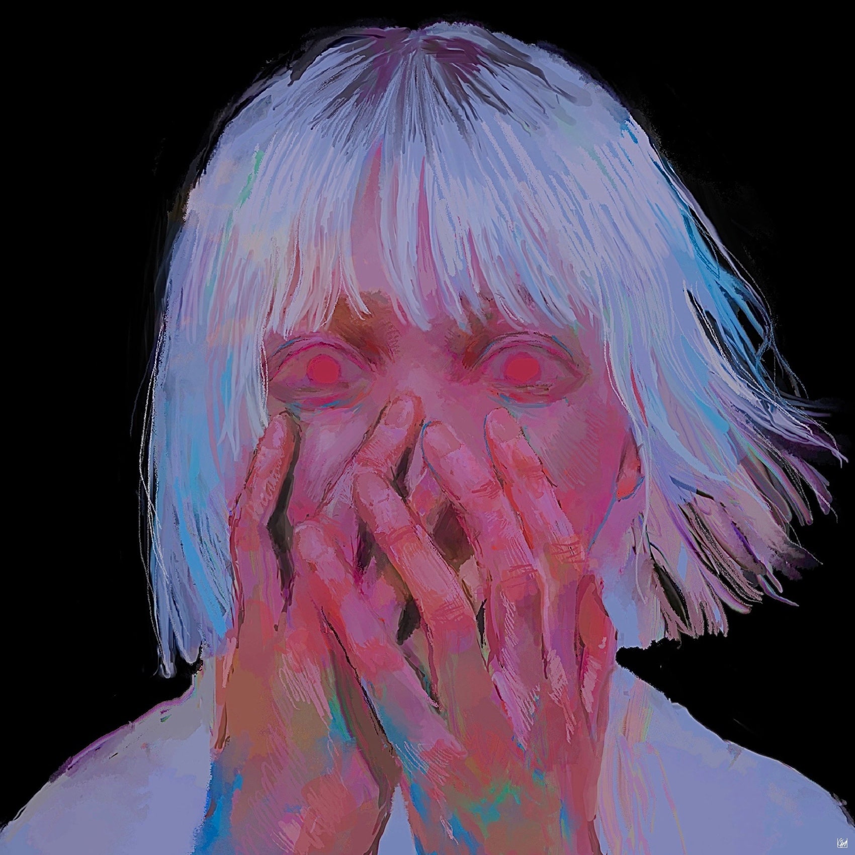 「泣く」という有機的な行為と、「サイボーグ」という無機的な存在を組み合わせたこの名の通り、対照的な事柄や色の数々を、「一つの物事に起こる矛盾や複雑性、そこに起こる痛みや叫びこそこの世の本質」とした上で一つの画面に引き摺り下ろして絵を描いています。甘くて苦いあたしの世界にようこそ。