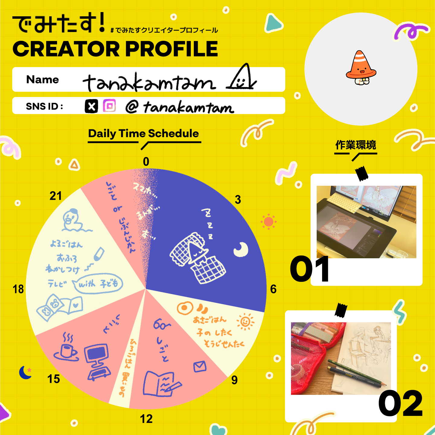 可愛い服や衣装をきた女の子の絵を描くのが得意です。いろんなジャンルのファッションが好きですが、フリルやリボンったっぷりのアイドルのような服を描くのが一番好きです。線は優しい雰囲気に、配色はポップな雰囲気に仕上げて少し非現実感のある仕上がりを意識しています。